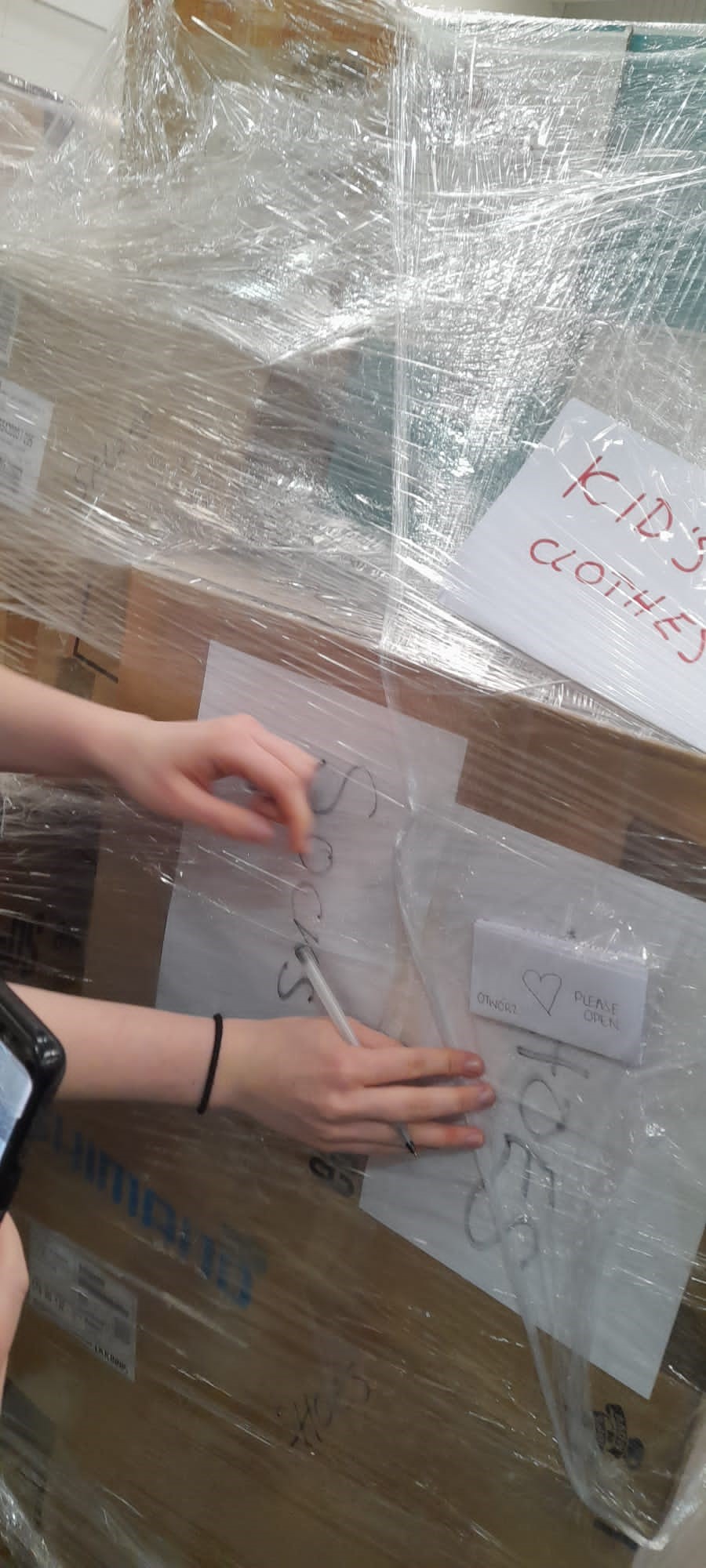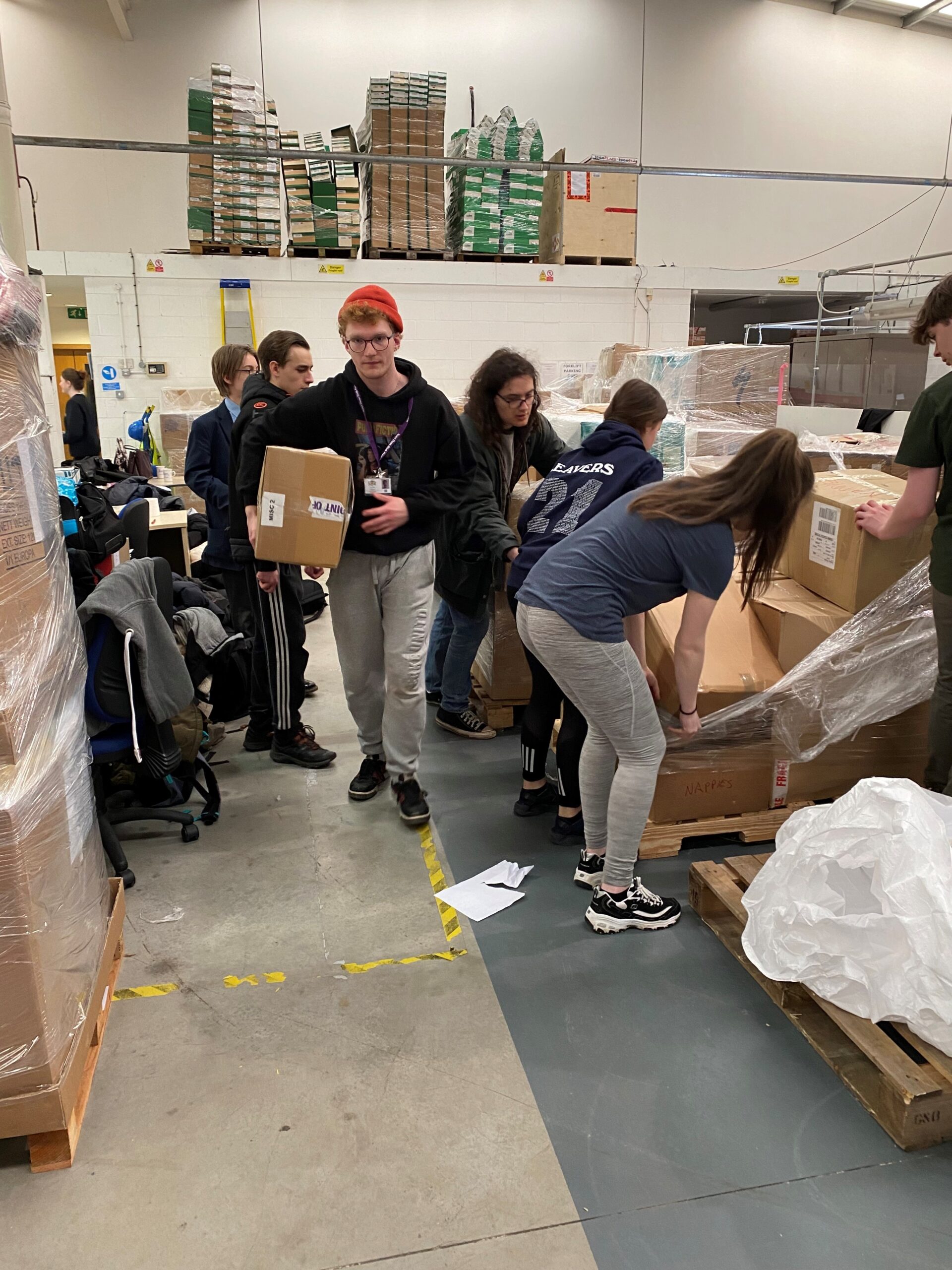 The students started work at around 10am in the morning and did not stop working until 2.30pm, with only a short break in between. Students were split into groups and worked together with an adult volunteer who helped direct them. Students carried boxes and lifted them onto pallets, they labelled boxes, re-organized items to go in boxes, taped up the loads of pallets when they were complete. Students even had time at the end of the day to write messages to the people of Ukraine which were placed in the cellophane wrapping so that when the pallets arrive people will be greeted with messages of prayers and kindness from our wonderful young people.