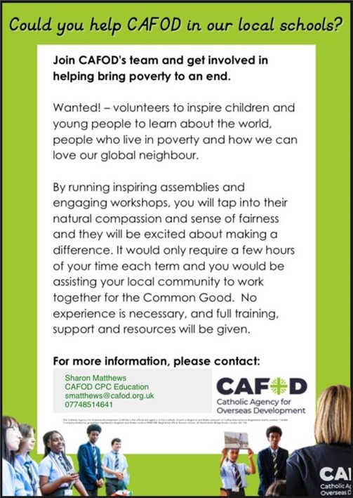 Our diocese are looking for new CAFOD School Volunteers. It’s a rewarding role, where our volunteers share CAFOD’s inspiring stories of hope […]